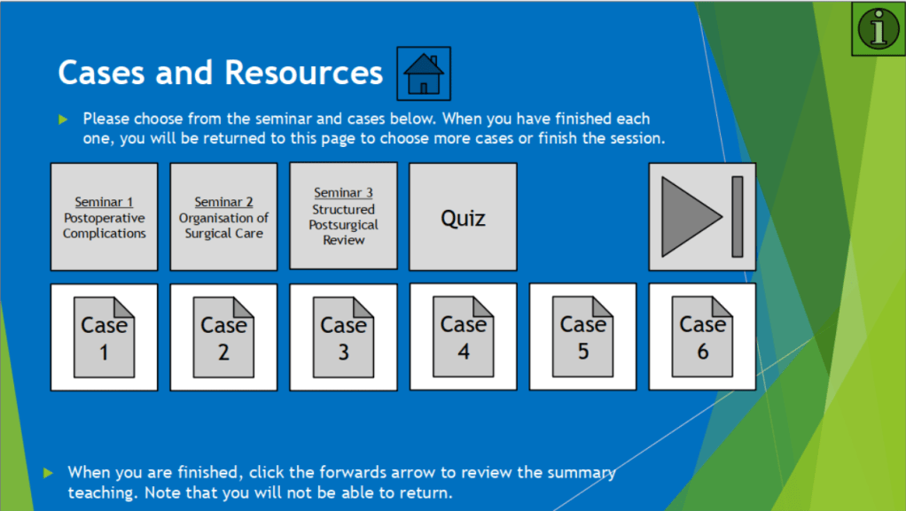 The resources are designed for you to work through by yourself. They contain seminars (with traditional didactic information), but also cases that allow you to immerse yourself into a clinical scenario, make decisions, and experience the outcomes or consequences.